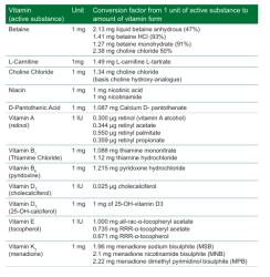 1 mg active = 1.34 mg choline chloride (based on choline hydroxyl analogue)